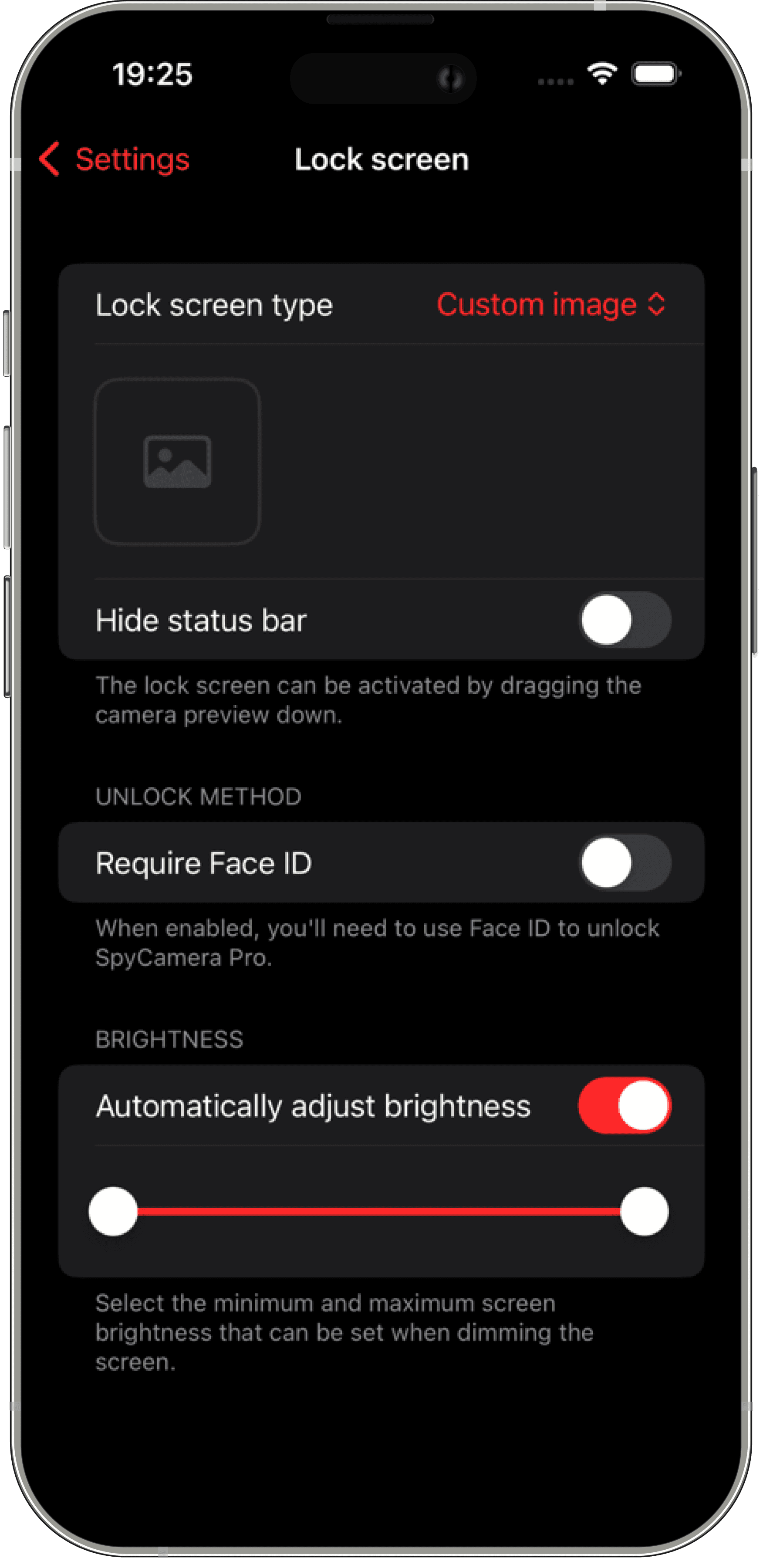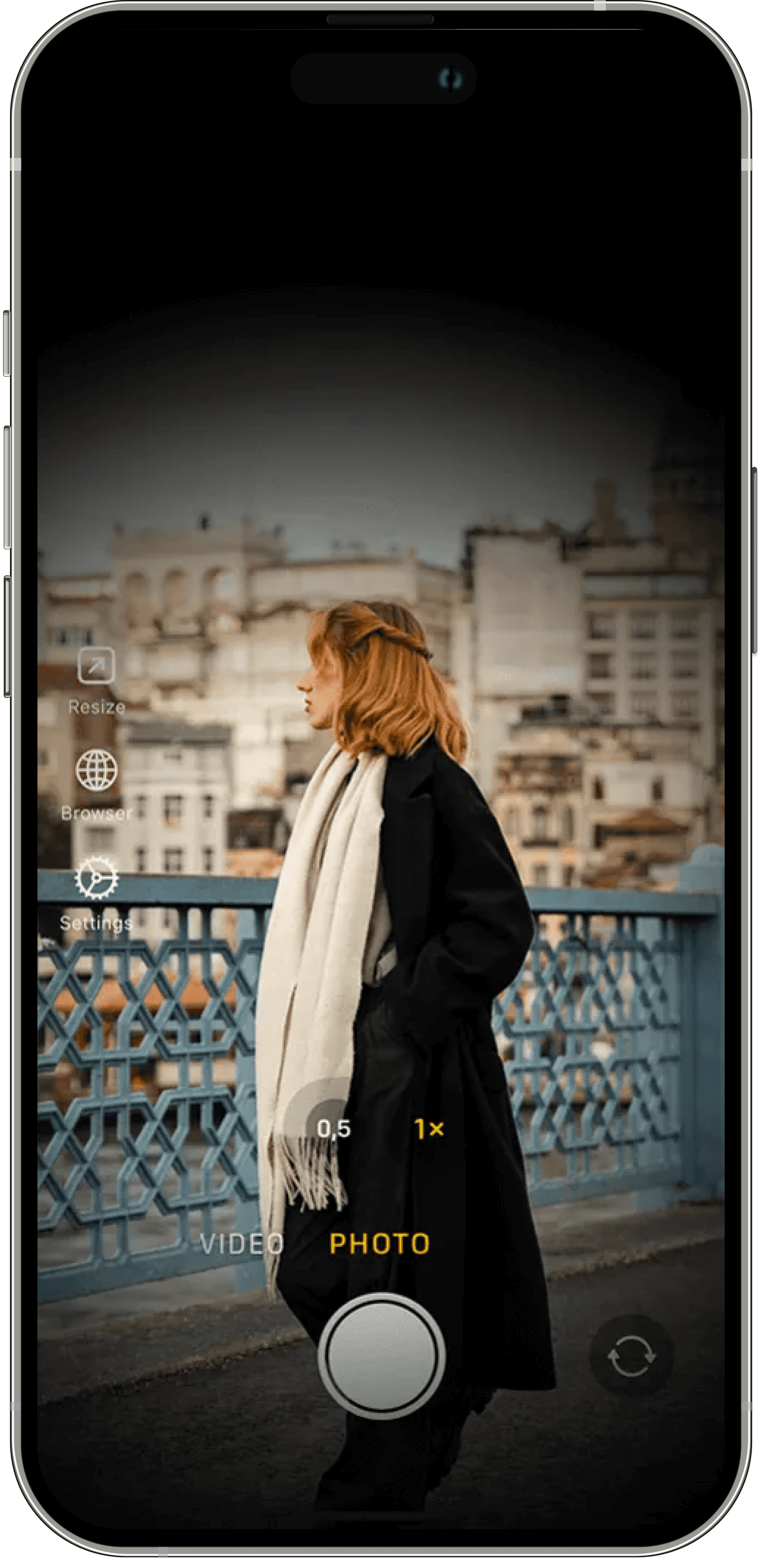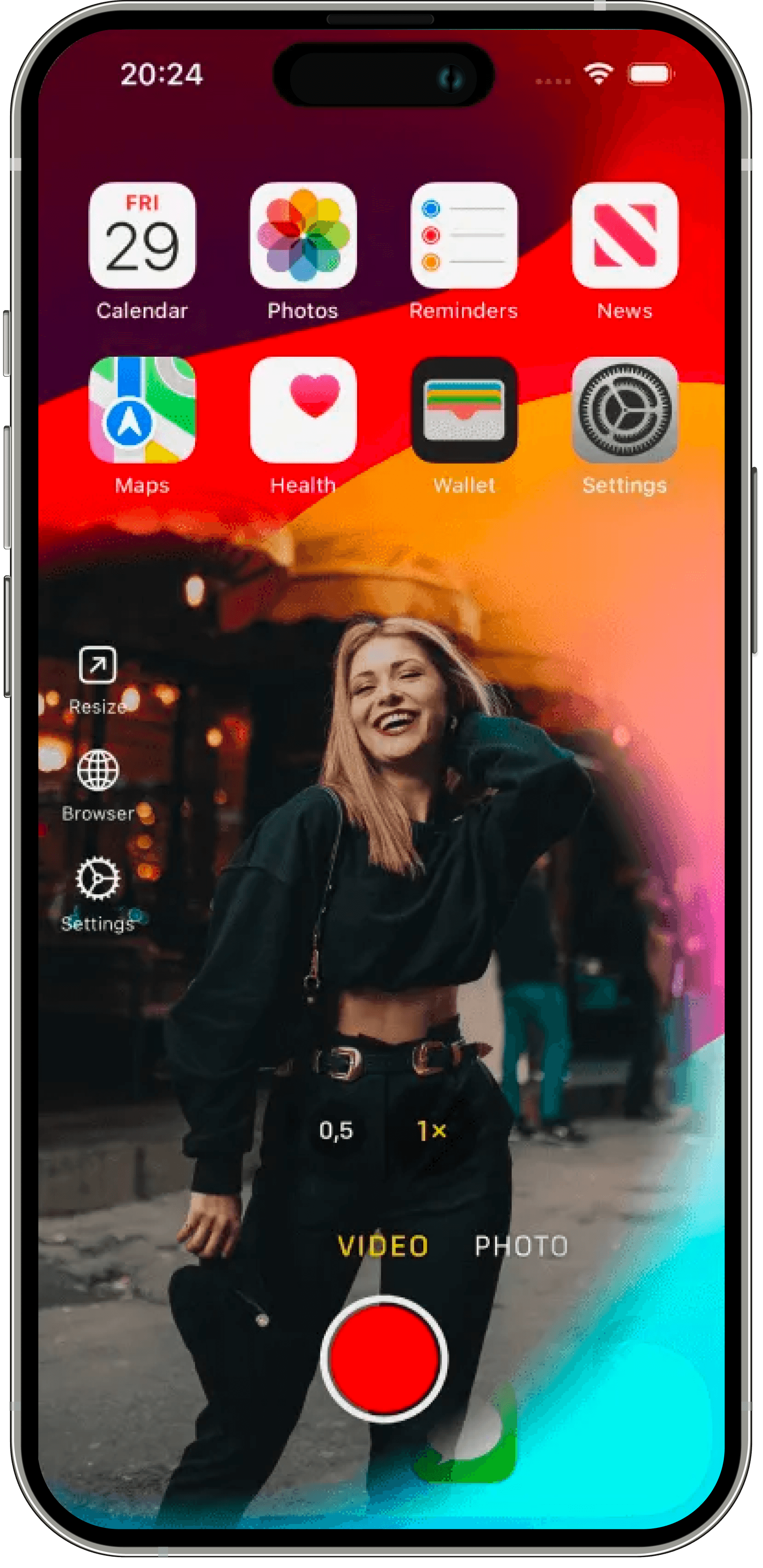 Press to start/stop recording. Swipe down for black screen/fake background, swipe up for preview.